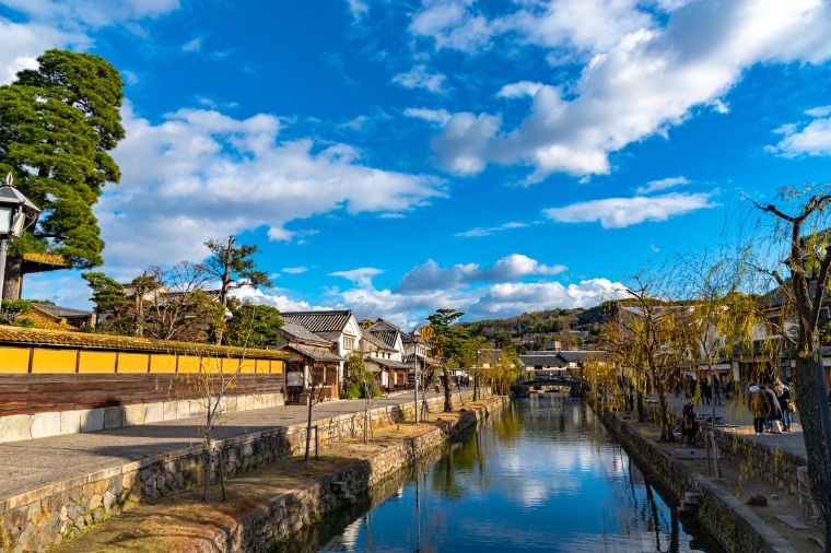 【倉敷美觀地區】保存著日本江戶時期直轄地盛極一時的繁榮情景,一街一景都有著樸實的風味。流過整個倉敷美觀地區的倉敷川是1條由石垣砌成的河道,其中有10座青石拱橋跨越兩岸。漫步在古意盎然的純樸街道中,沿途可以欣賞商人們用於貯存貨物的白色牆壁的倉庫,至今尚保存著的貨場、大八車(過去運送物資的車)通行的石板路、相當於古時的路燈的常明燈等等,反映出當時的繁榮景象。