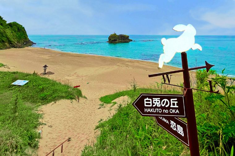 【白兔海岸】為日本古代神話的場景,以因幡白兔和大黑神而著名的日本古代的神話舞台~白兔海岸,至今仍延用當時神話中的地名。在海岸的東邊可見獨特的白兔岩層,因幡的白兔神話神秘又有趣,想像空間引人入勝。