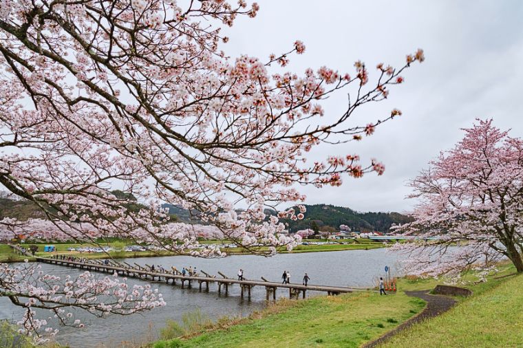 【斐伊川堤防】位於島根縣雲南市,全長約2公里的斐伊川堤防桜並木,被譽為「日本櫻名所百選」之一。每到春季,約800棵染井吉野櫻沿著堤防同時綻放,粉白色花海與清澈的斐伊川相映成趣,景色壯麗夢幻。堤防兩側形成櫻花隧道,漫步其間宛如走進浪漫畫卷。櫻花季期間更會舉辦「雲南櫻花祭」,夜間點燈照亮櫻花樹影,呈現白天與夜晚截然不同的風情。無論是白日的壯闊景致,還是夜櫻的幽美氛圍,都使這裡成為團體賞櫻、感受日本春天魅力的理想景點。